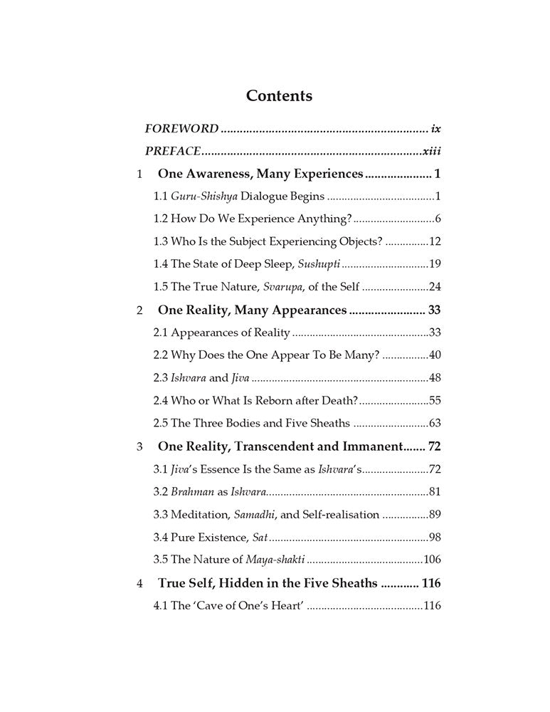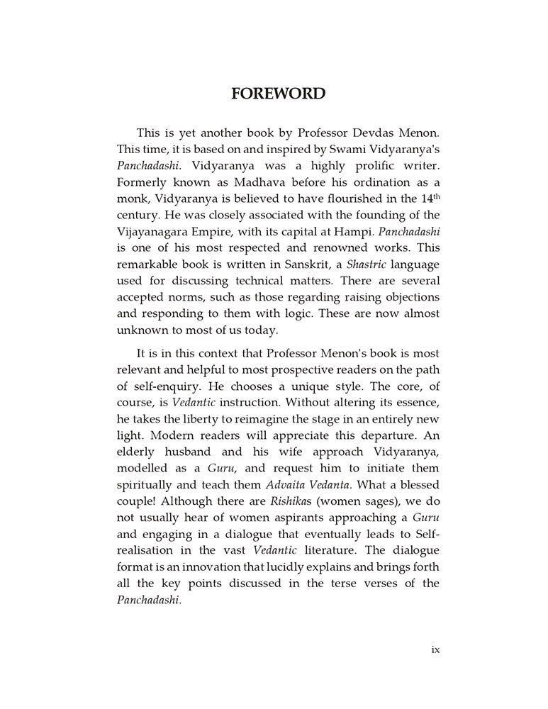 Vidyaranya's Panchadashi is a classical 14th-century poetic work on Advaita Vedanta. This book, authored by Devdas Menon (Professor, IIT Madras), presents Vidyaranya's profound wisdom in a unique and lucid manner-not as a verse-by-verse translation and commentary, but as a dialogue between a Guru (Vidyaranya) and an elderly husband-and-wife couple. Their questions-on life, suffering, bondage, liberation, and fulfilment-remain as relevant today as ever. Over nine weeks, they continue to raise doubts until they gain not only intellectual clarity but also, through meditation, an experiential understanding of what it means to be fulfilled and free from suffering.