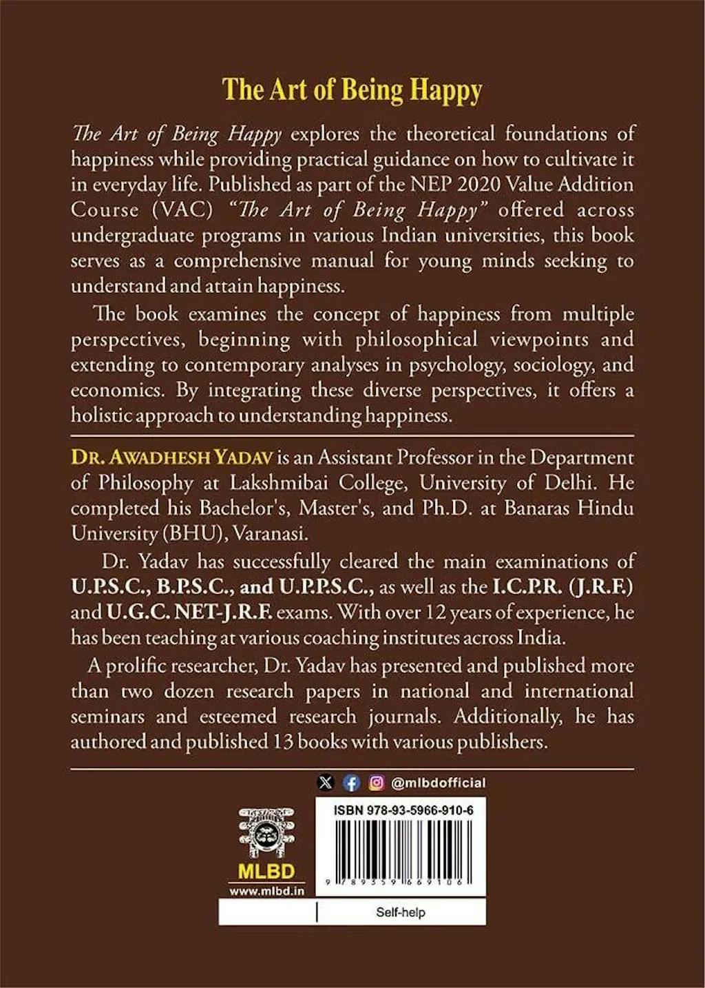 The Art of Being Happy explores the theoretical foundations of happiness while providing practical guidance on how to cultivate it in everyday life. Published as part of the NEP 2020 Value Addition Course (VAC) "The Art of Being Happy" offered across undergraduate programs in various Indian universities, this book serves as a comprehensive manual for young minds seeking to understand and attain happiness.