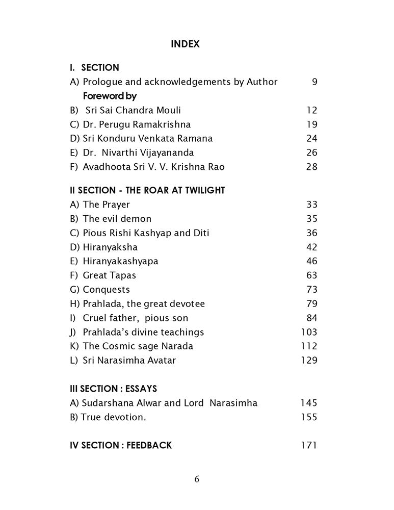 The Roar at Twilight narrates the story of the great five- year-old devotee Prahlada, born to the demon Hiranyakashyapa. It describes how his father repeatedly attempts to kill his own son, but in vain; how the noble Prahlada teaches the demon boys about Bhakti, which he had learned from Sage Narada (Parabrahma) while still in his mother's womb; and finally, how Lord Vishnu takes the avatar of the lion- man, Narasimha, and slays the evil demon Hiranyakashyapa. This book has been composed in 108 Shakespearean sonnets.